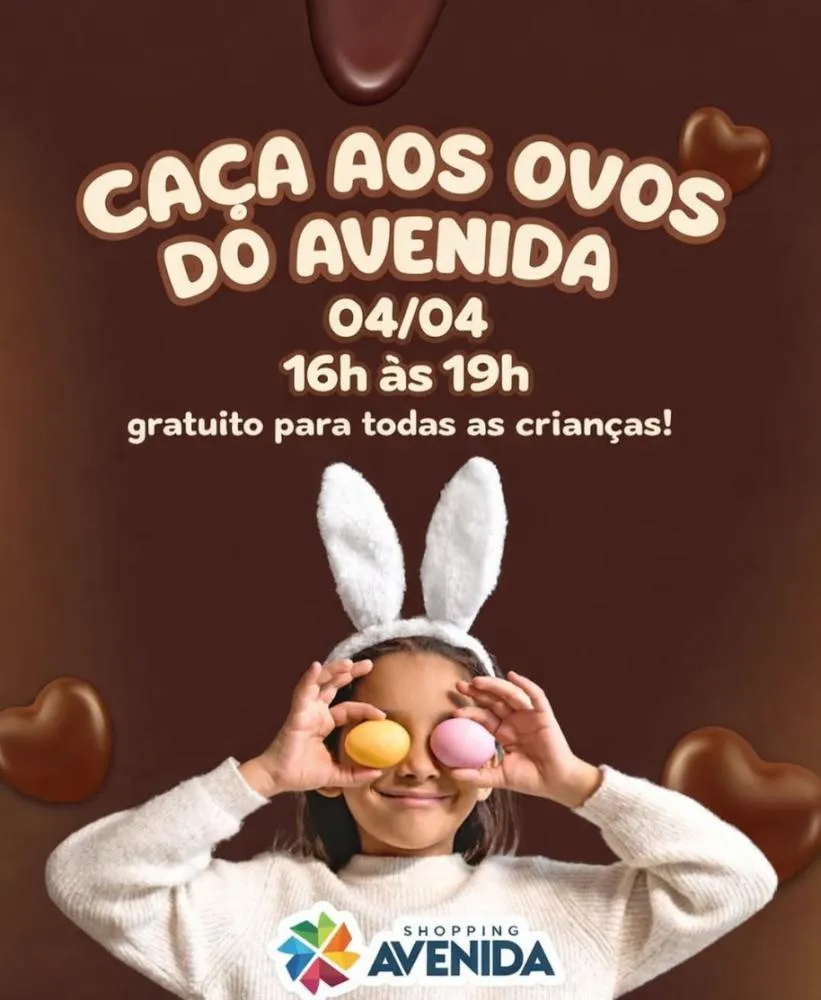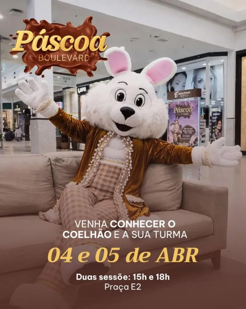 Para as crianças, a programação de Páscoa ganha destaque. No Shopping Avenida, a tradicional Caça aos Ovos acontece no sábado, dia 4, das 16h às 19h, com brincadeiras, circuito interativo e distribuição de chocolates. Já no Shopping Boulevard, o encontro com o Coelho da Páscoa acontece nos dias 4 e 5, com sessões às 15h e 18h, incluindo fotos, pintura facial e atividades lúdicas.