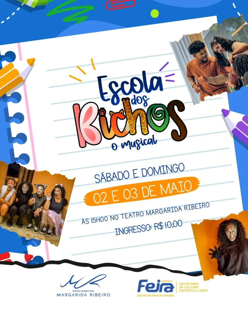 O musical “Escola dos Bichos” alegra o teatro Margarida Ribeiro, nos dias 02 e 03 de maio, às 15h. Entre falas, miados e canções, cada “bichinho” precisa lidar com suas próprias inseguranças, e aprender a conviver com as diferenças num ambiente lúdico. O conteúdo, que é livre para todos os públicos, conecta crianças e adultos em uma trama surpreendente, enquanto revela a história de cada animal.